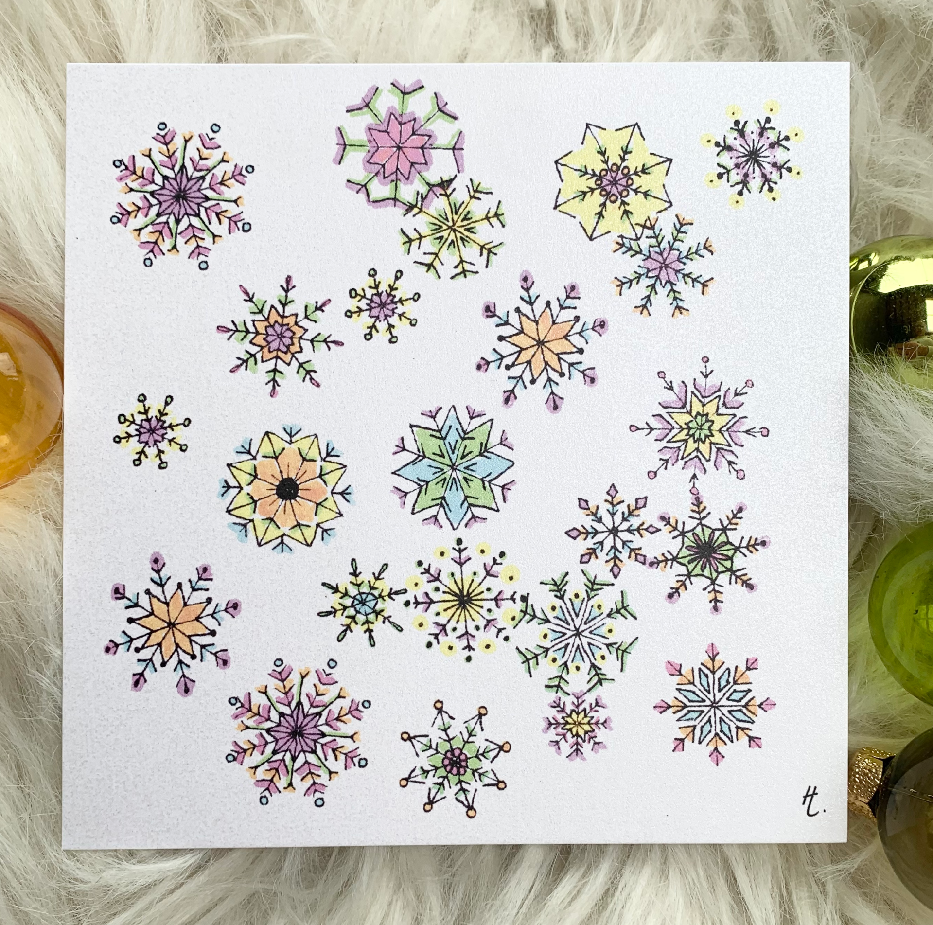 Een set bestaat uit 2x kerstbomen met een witte achtergrond, 2x vlokken met een witte achtergrond en 1x vlokken met een lichtblauwe achtergrond.